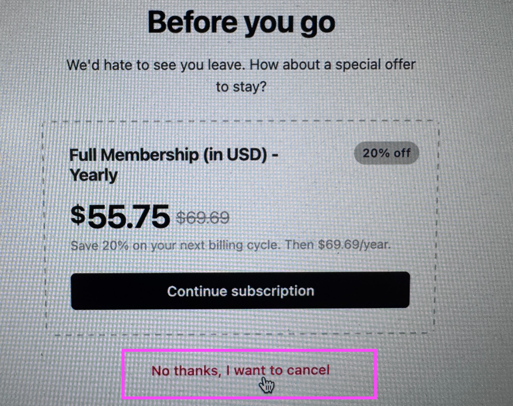 You may be offered a deal in case you want to stay. If this doesn't appeal, then hit "no thanks, I want to cancel."
