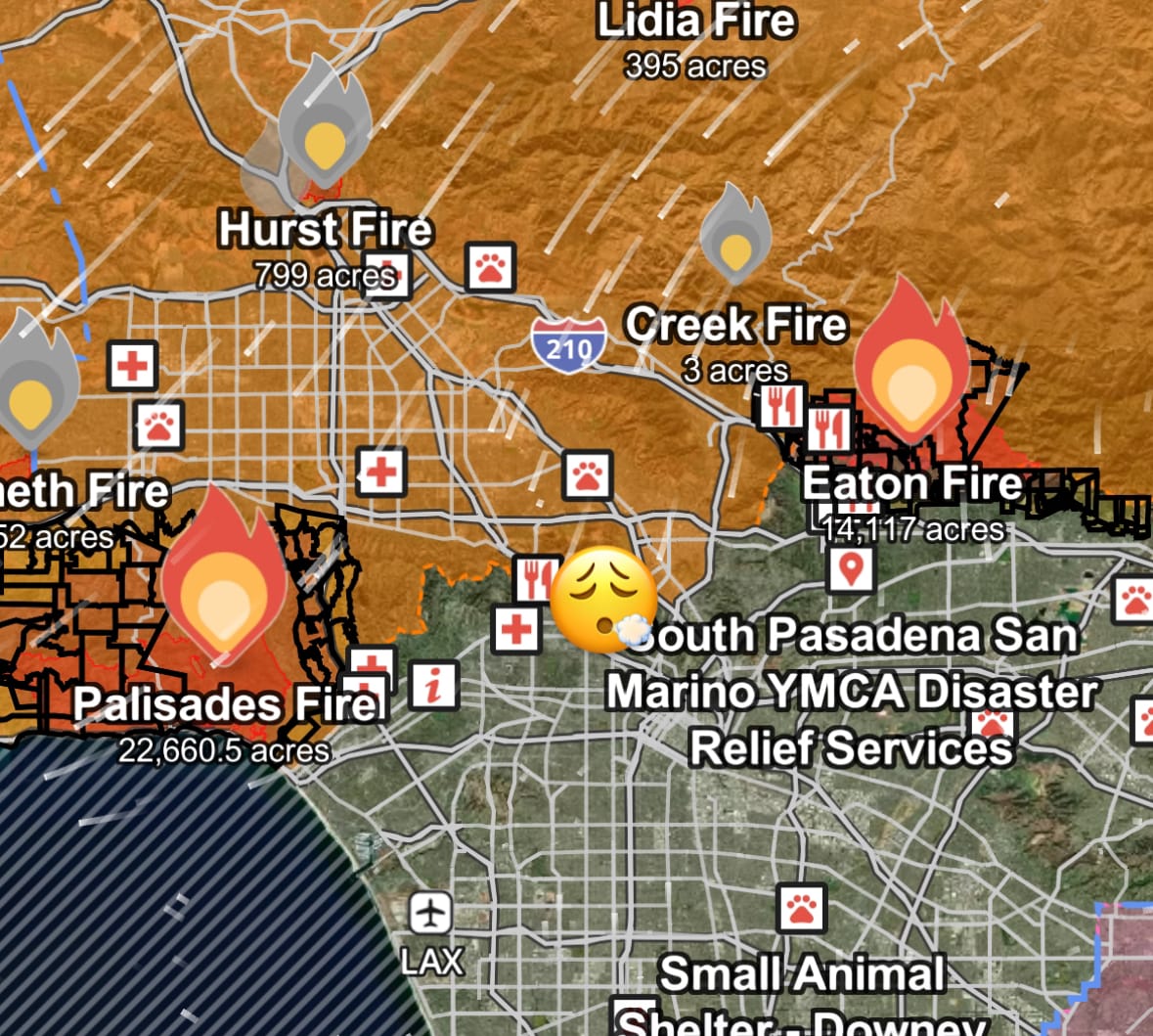 Hotels are expensive, so after the fire near my neighborhood was contained on Friday, we drove back. This is how things currently look on the Watch Duty app (I am the huffing emoji, just inside the current “safe zone”).