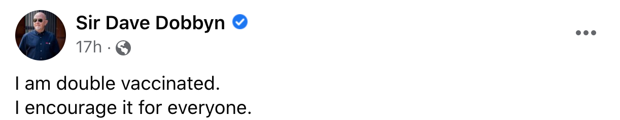 What would have been great next is if Dave Dobbyn had replied with: “Oh yes, it is important we get vaccinated. I know it’s not a cure-all, but I do know it decreases the chance you’ll catch Covid, or pass Covid on.”