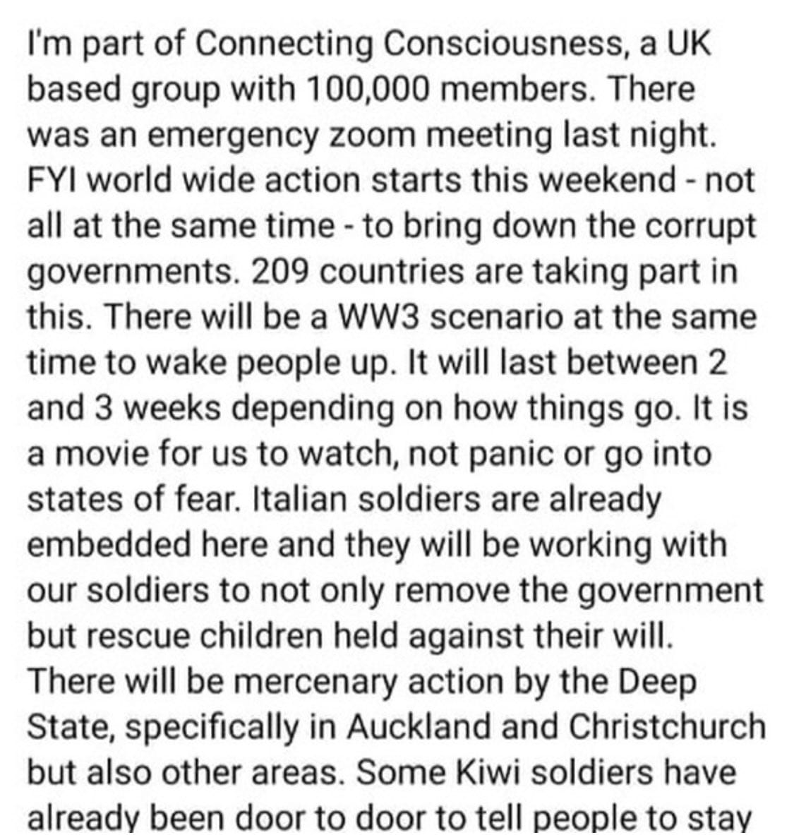 “203 countries taking part in this. This will be a World War III scenario at the same time to wake people up. It will last between two and three weeks […] Italian soldiers are already embedded there…”