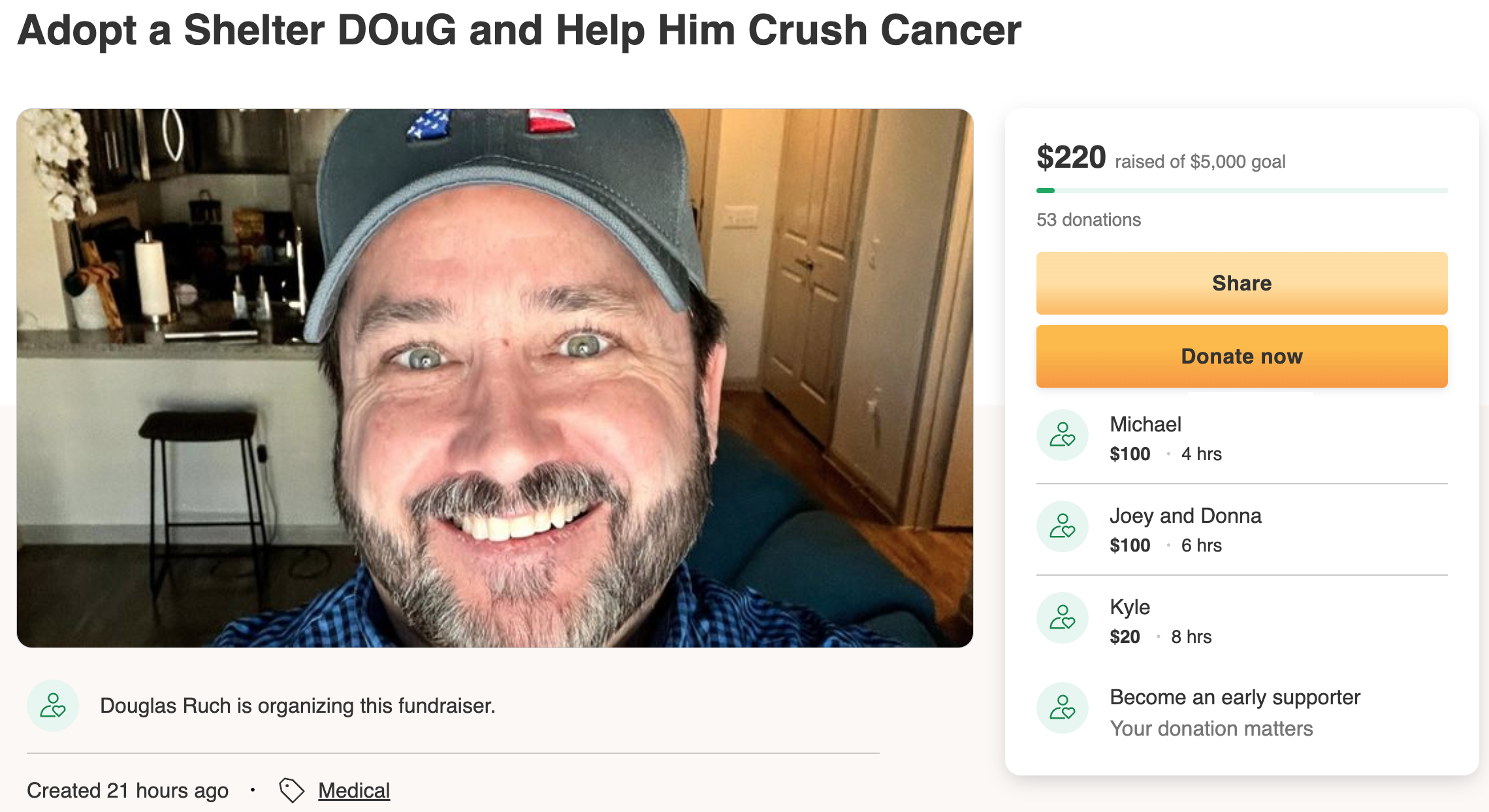 And there's something to note in all of these reports: Every one of them linked to Doug's pun-worthy website, DyingToServe.com, which linked directly to his GoFundMe account.