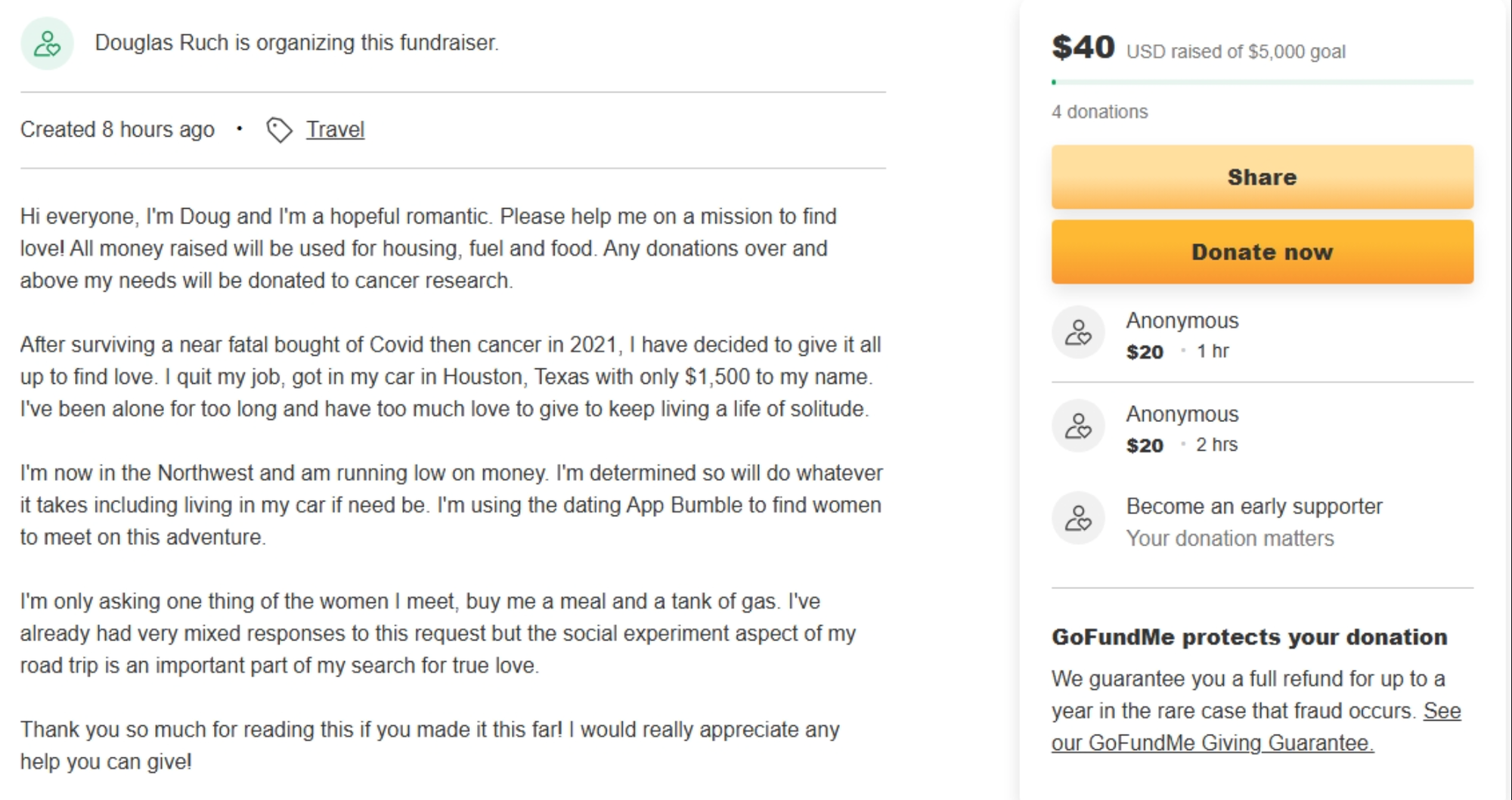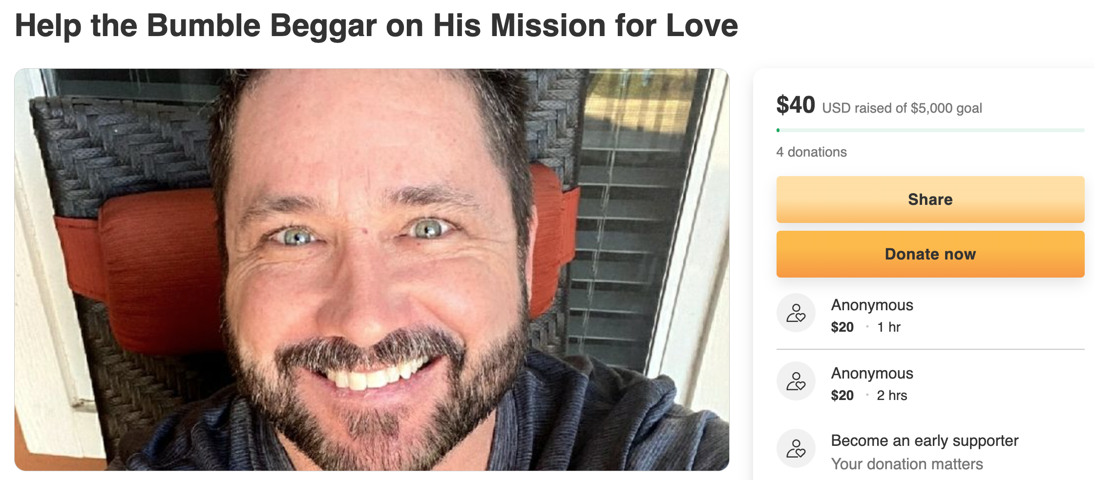 By August he'd closed those fundraisers, moving into what Webworm would call "severe ick territory". One saw him calling himself the "Bumble Beggar" in an attempt to get women to take him on a date, before paying for his food and gas.