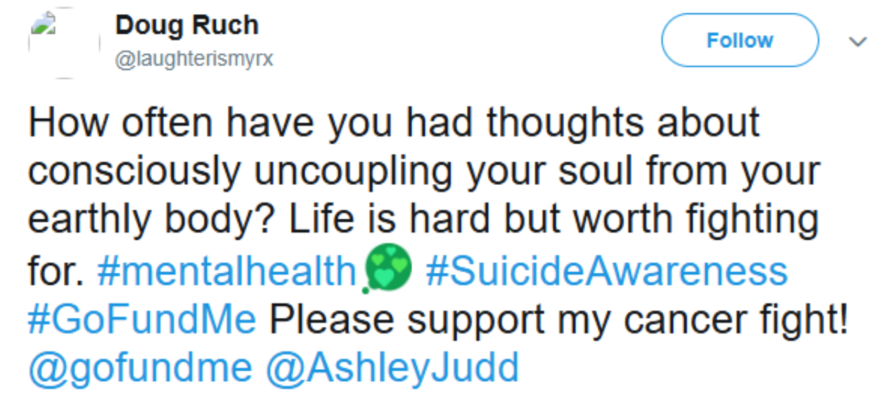 A month later he created another campaign called "Please Help Comic Beat Cancer And Get Free Joke". He tagged Ashley Judd on social media, hoping to get her attention.