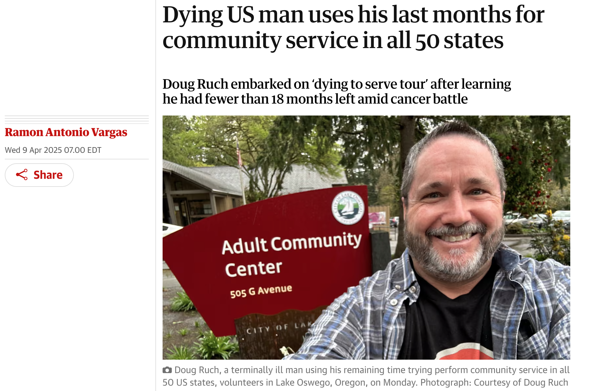 "Doug Ruch returned to his San Antonio apartment and reflected on one of his biggest regrets: being too focused on himself, not giving enough to others. He had spent most of his savings on his cancer treatment, so he decided he would launch a fundraiser and hope others would help him achieve his dying wish: volunteering in every state."