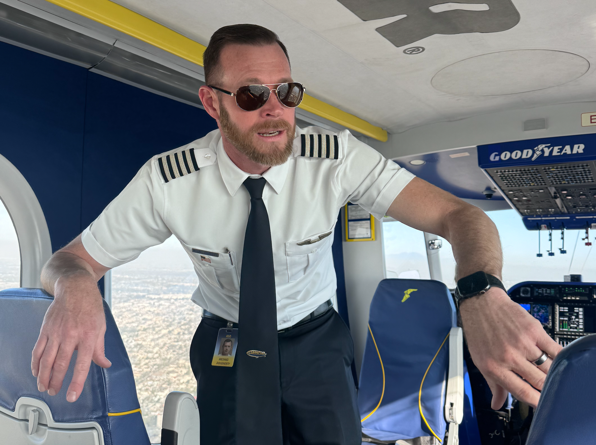 And yeah — we lifted off. This is “Doc” who’s been flying the Goodyear blimp for almost 20 years — alarmingly not behind the controls. Luckily there’s a co-pilot hidden behind his arm. I think. I am only noticing this now. Good God.