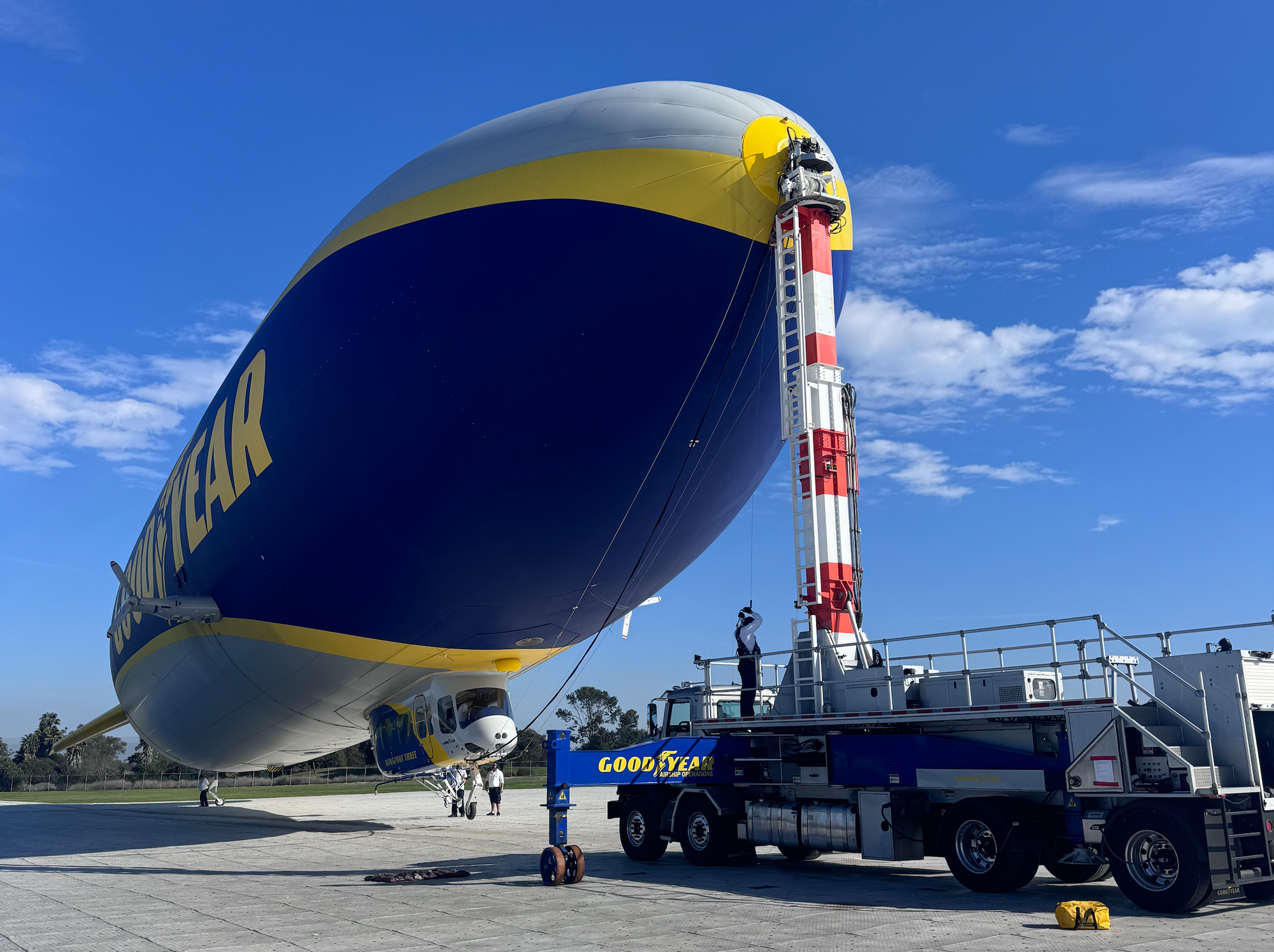 I learnt that the Goodyear blimp can travel 117 km (73 miles) a day and can fly to about 10,000 feet — although we stuck to about 1000. I learn that on cross-country trips there’s a support team that travels by road, allowing the blimp to land and dock.