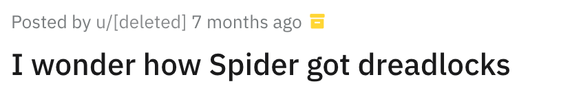 I didn’t care about Spider’s stupid face mask, I cared about Spider’s dreads.