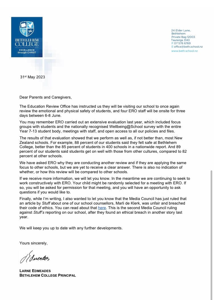 Webworm has obtained a letter sent out to parents, from Bethlehem College principal Larne Edmeades.