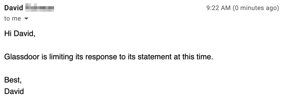 I reached out to Global Gateway Advisors, the PR reps for Glassdoor — who got me this statement back in exactly 32 minutes.