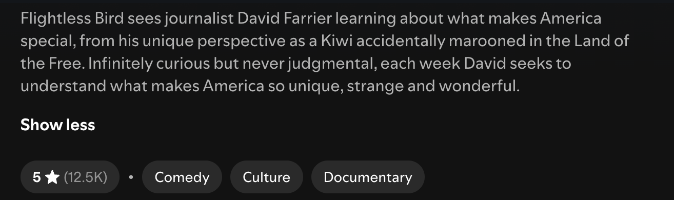 (Those are all Spotify links as they embed easily, but episodes are found wherever you listen to podcasts: linktr.ee/flightlessbirdpod).