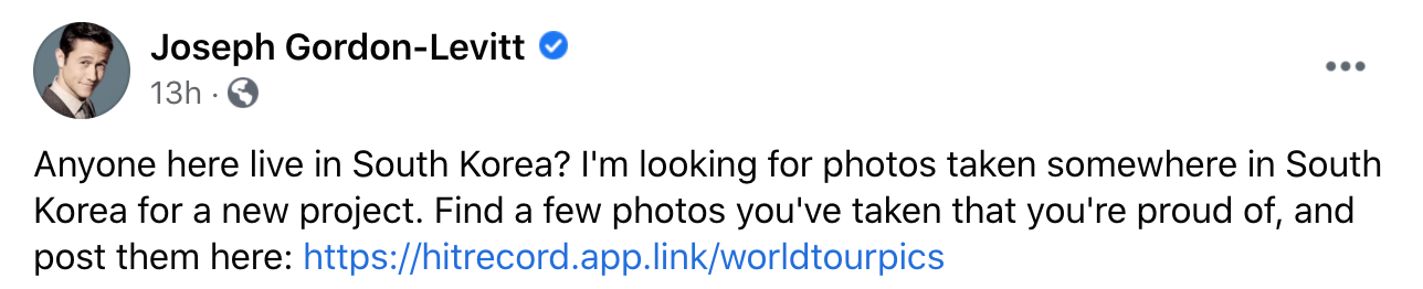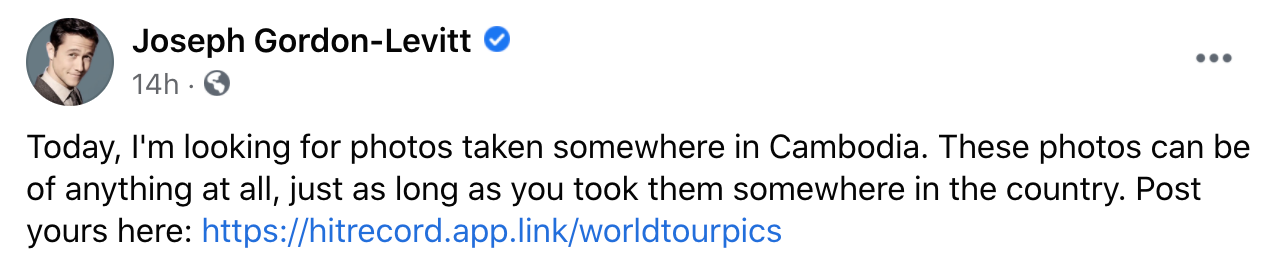 “Thought I’d just give you the context — we promote a bunch of prompts to (hopefully) inspire people to take pictures/write/make music for collaborative projects going on on our hitrecord platform. We’ve found that people enjoy sharing and making things about where they live, hence those specific prompts that are focused on countries and regions… “