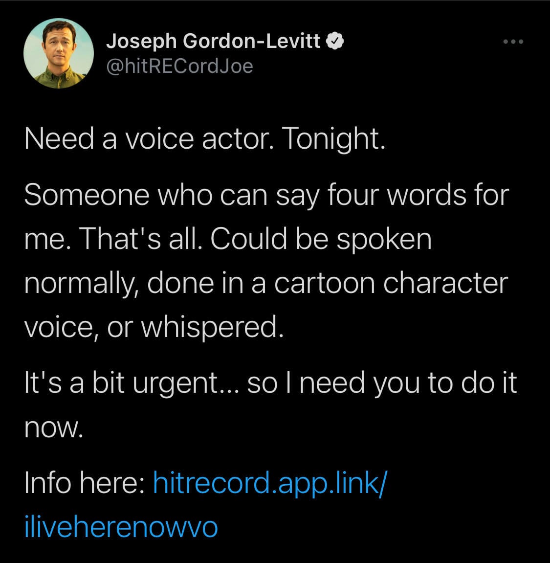 All Joseph would do — all day long — was post these prompts. I felt like I was going crazy. Twitter was also a hotbed of madness, and Joseph Gordon Levitt is clearly committed to the bit — his Twitter handle is @hitRECordJoe.