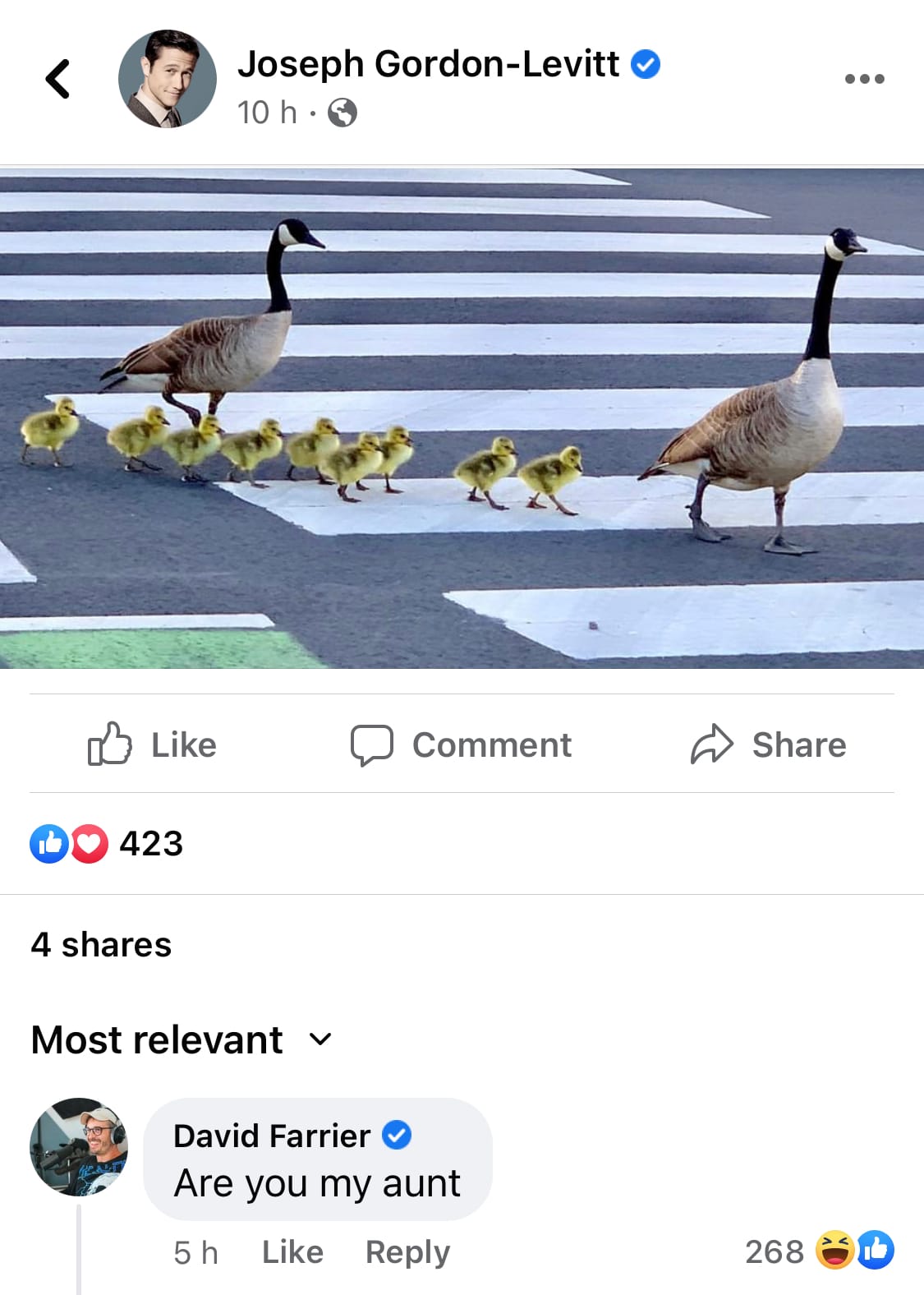When Joseph posted “Quick! Open your camera roll and find a happy photo!” followed by a photo of a family of geese, I immediately typed “Are you my aunt?” underneath.
