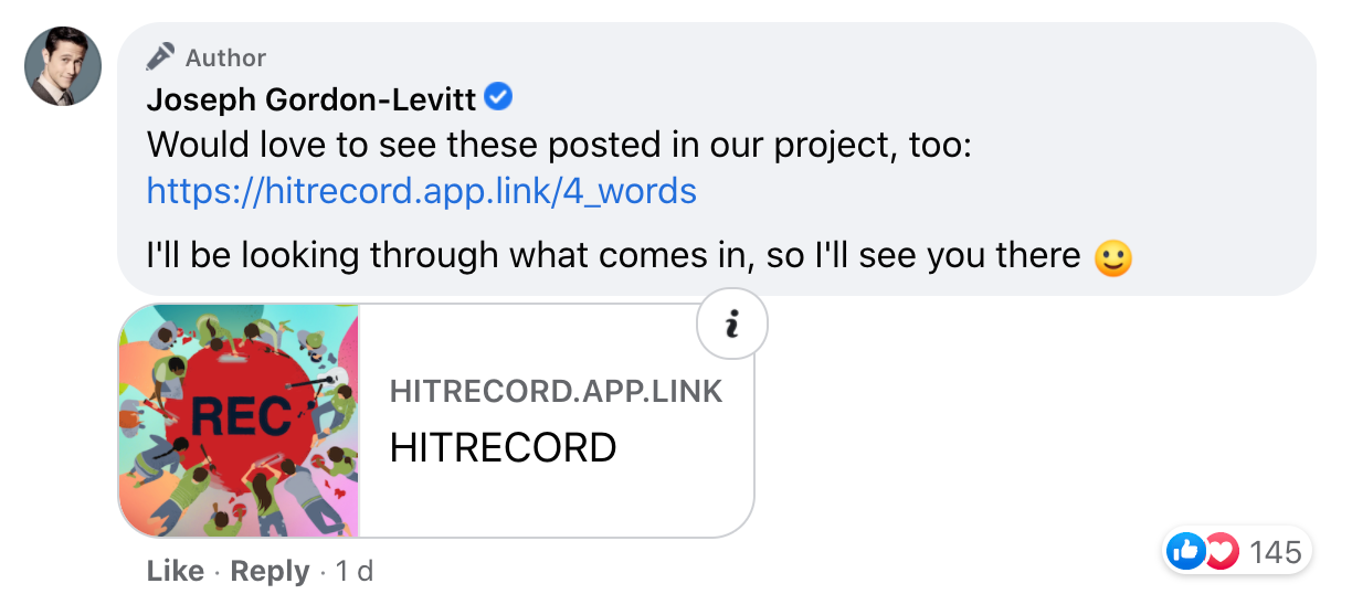 As well as reaching JGL’s rabid fanbase, my tweets also got the attention of Jared Geller, President & Co-founder of HitRecord. He slid into my DMs, mentioning that we had mutual friends. He was friendly, kind, and perhaps a little horrified at my astonishment.
