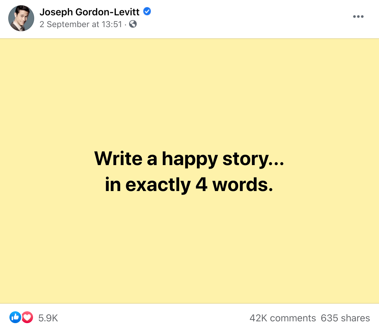 The last time I checked, that nonsensical “Write a happy story in exactly four words” had 5.9 thousand likes, 635 shares and a staggering 42,000 comments on Facebook. Many of those comments were — perhaps not unsurprisingly — a happy story told in exactly four words: