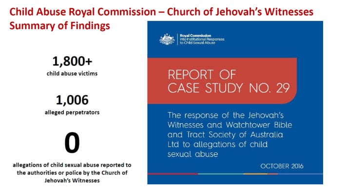 The enquiry revealed that since 1950 — in Australia alone — Jehovah’s Witnesses knew of 1,800 victims of child sex abuse by 1,006 alleged perpetrators.