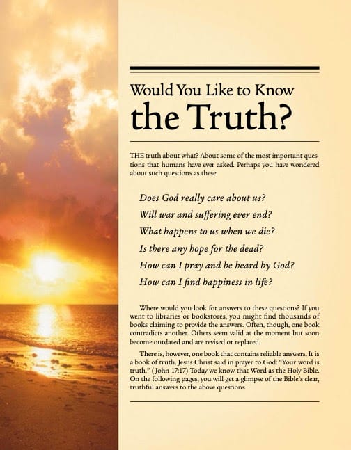 Jehovah’s Witnesses believe they have all the answers to life’s questions, and so they refer to their religion as “The Truth”. A person is either “in the Truth” or “not in the Truth”. When someone leaves the religion, they are “no longer in the Truth”. People who aren’t Witnesses are “worldly” and members shouldn’t socialise with them.
