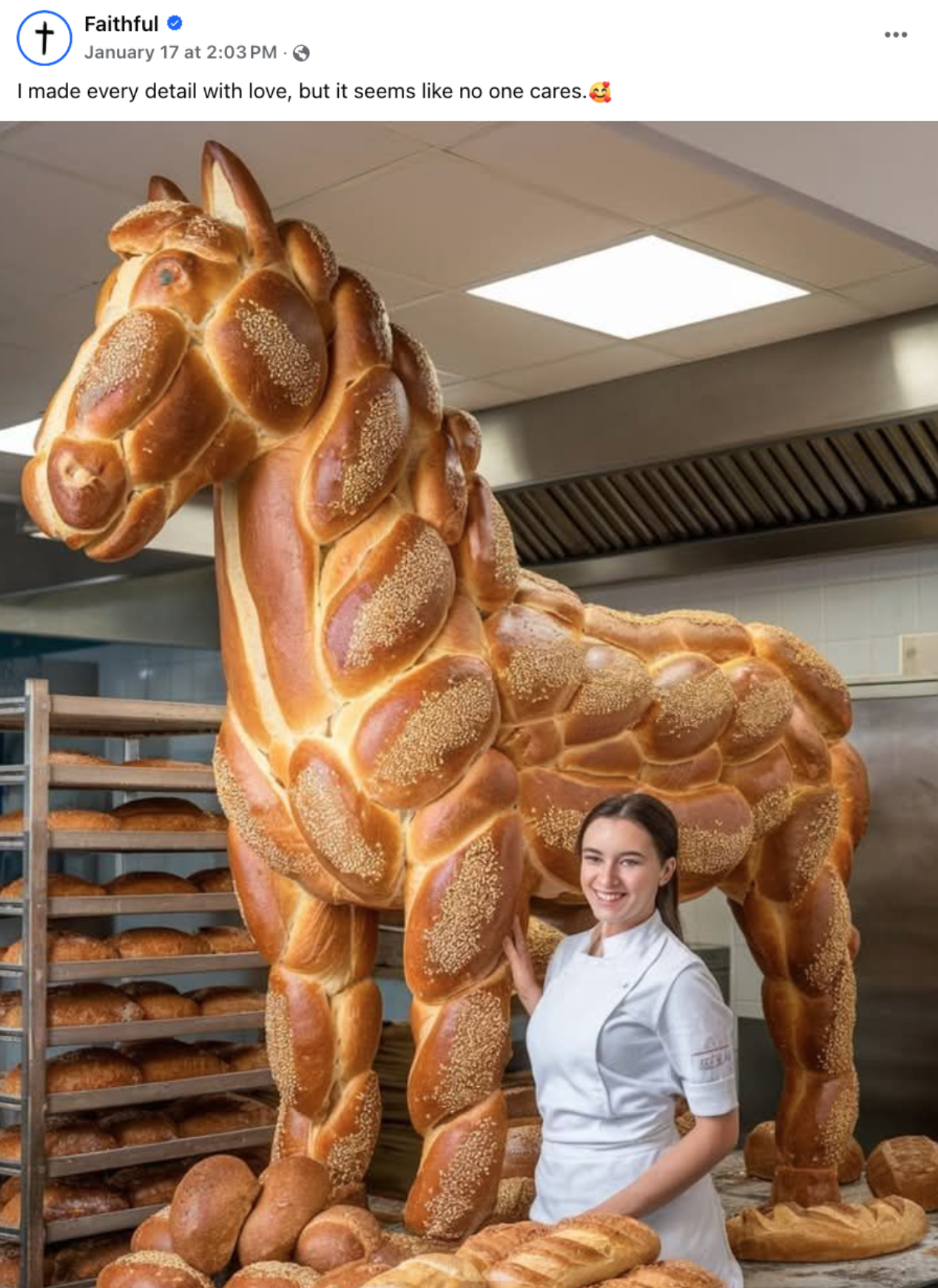 Those controlling the technology are not helping. Take “Faithful”, a verified Facebook page based out of Romania with 1.1 million followers that mostly spits out AI images of children with amputated limbs (to elicit sympathy views) or animals made out of bread (catnip for boomers):