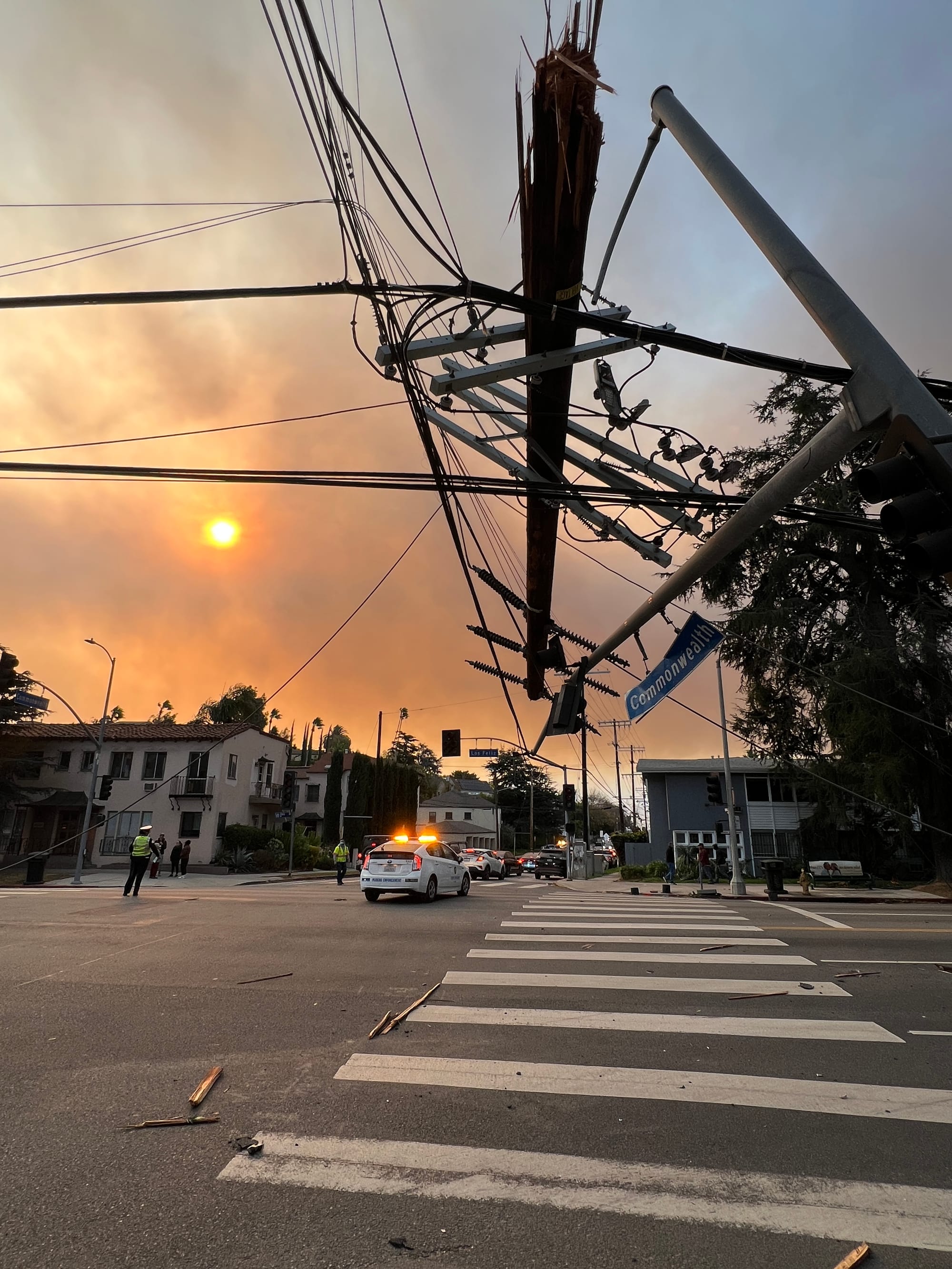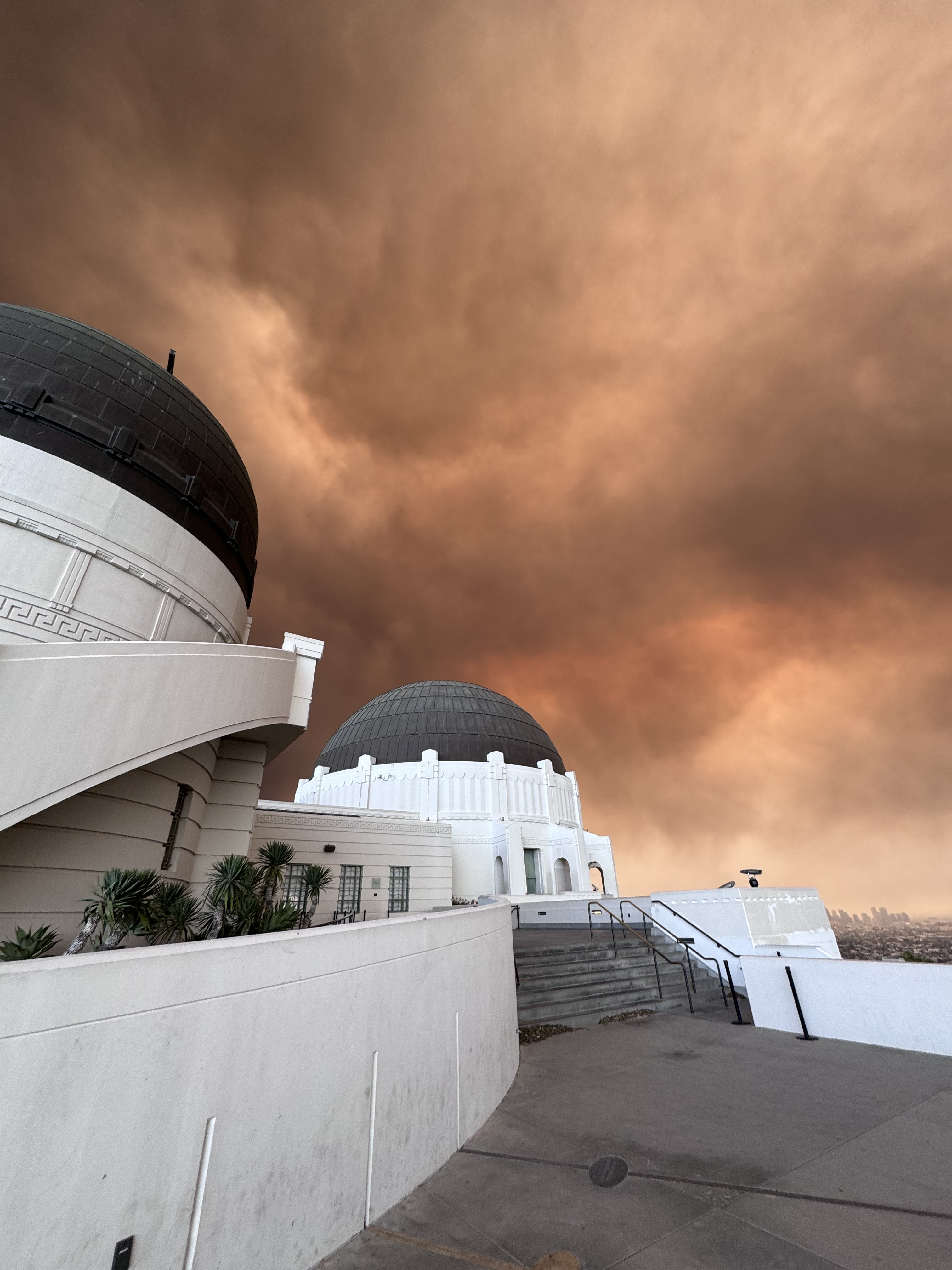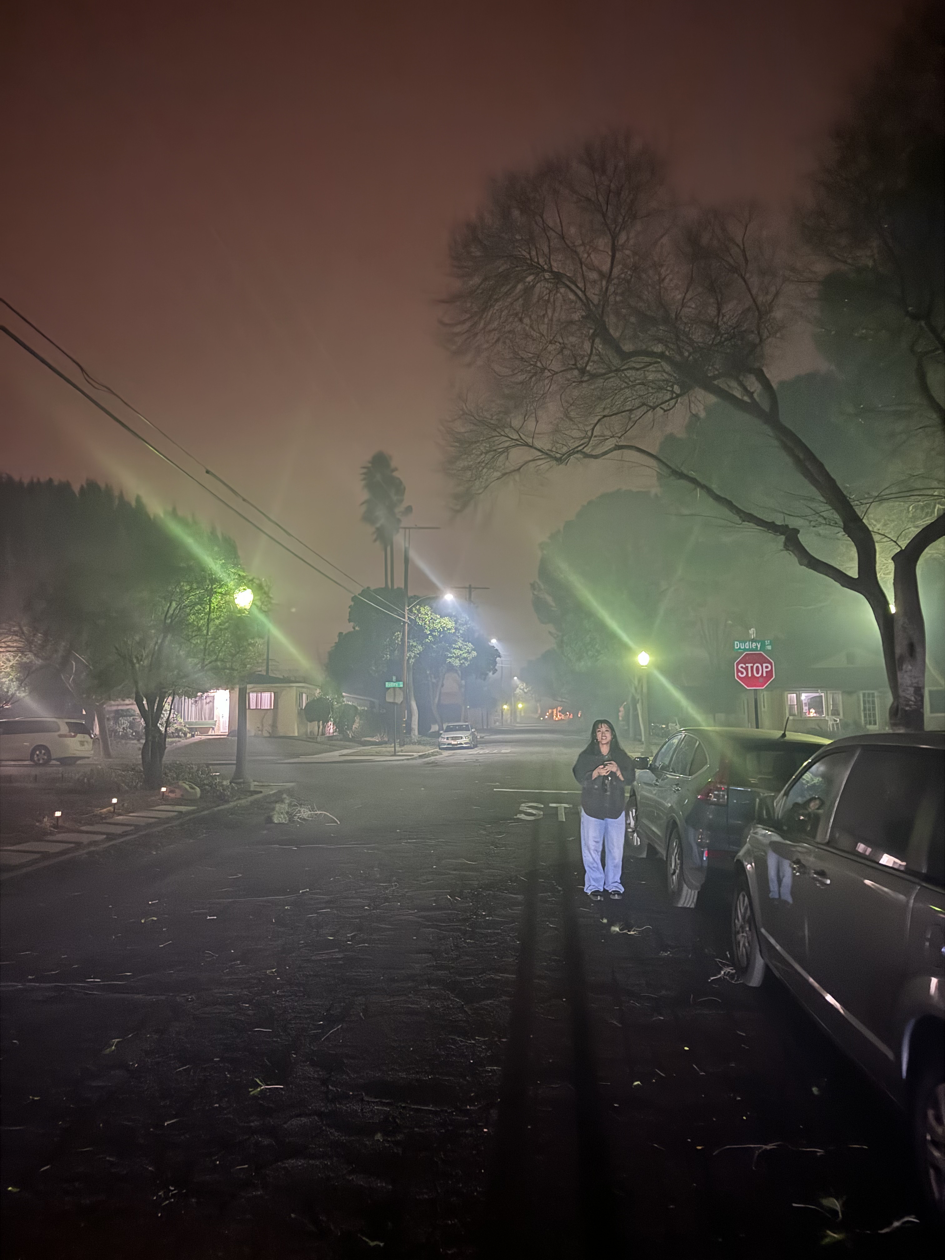 As we drove we noticed the sky on our left glowing bright red. That was a new fire — the Eaton fire — that started about an hour earlier. By the time we got to harp spot, the air was thick with smoke, helicopters, and sirens.