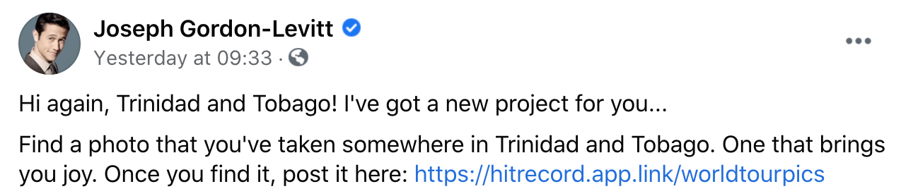 “Thought I’d just give you the context — we promote a bunch of prompts to (hopefully) inspire people to take pictures/write/make music for collaborative projects going on on our hitrecord platform. We’ve found that people enjoy sharing and making things about where they live, hence those specific prompts that are focused on countries and regions… “
