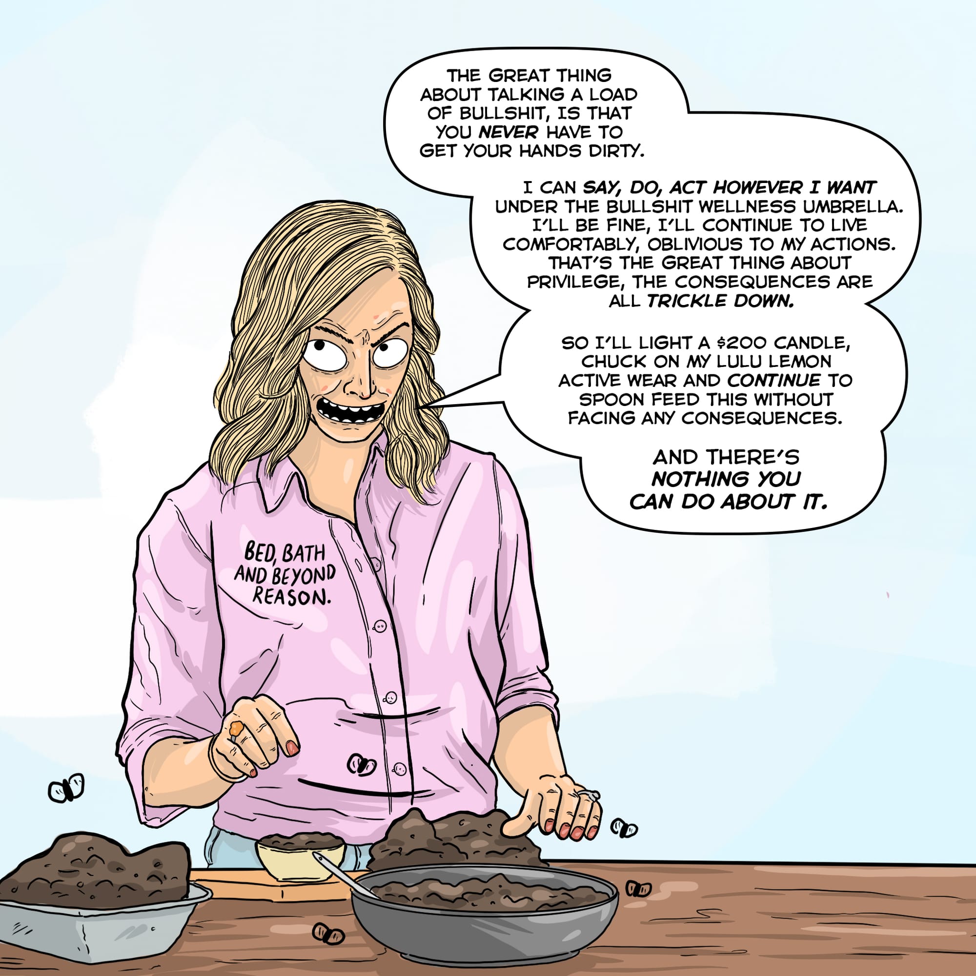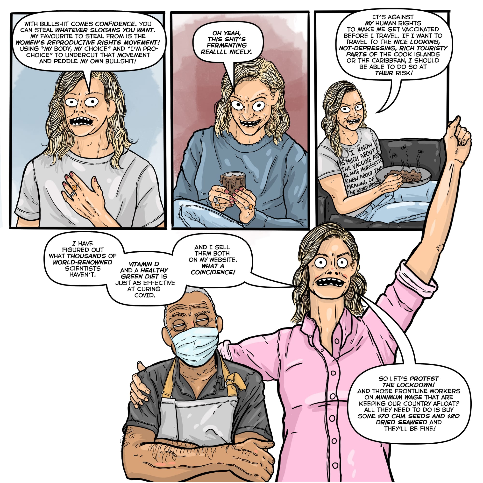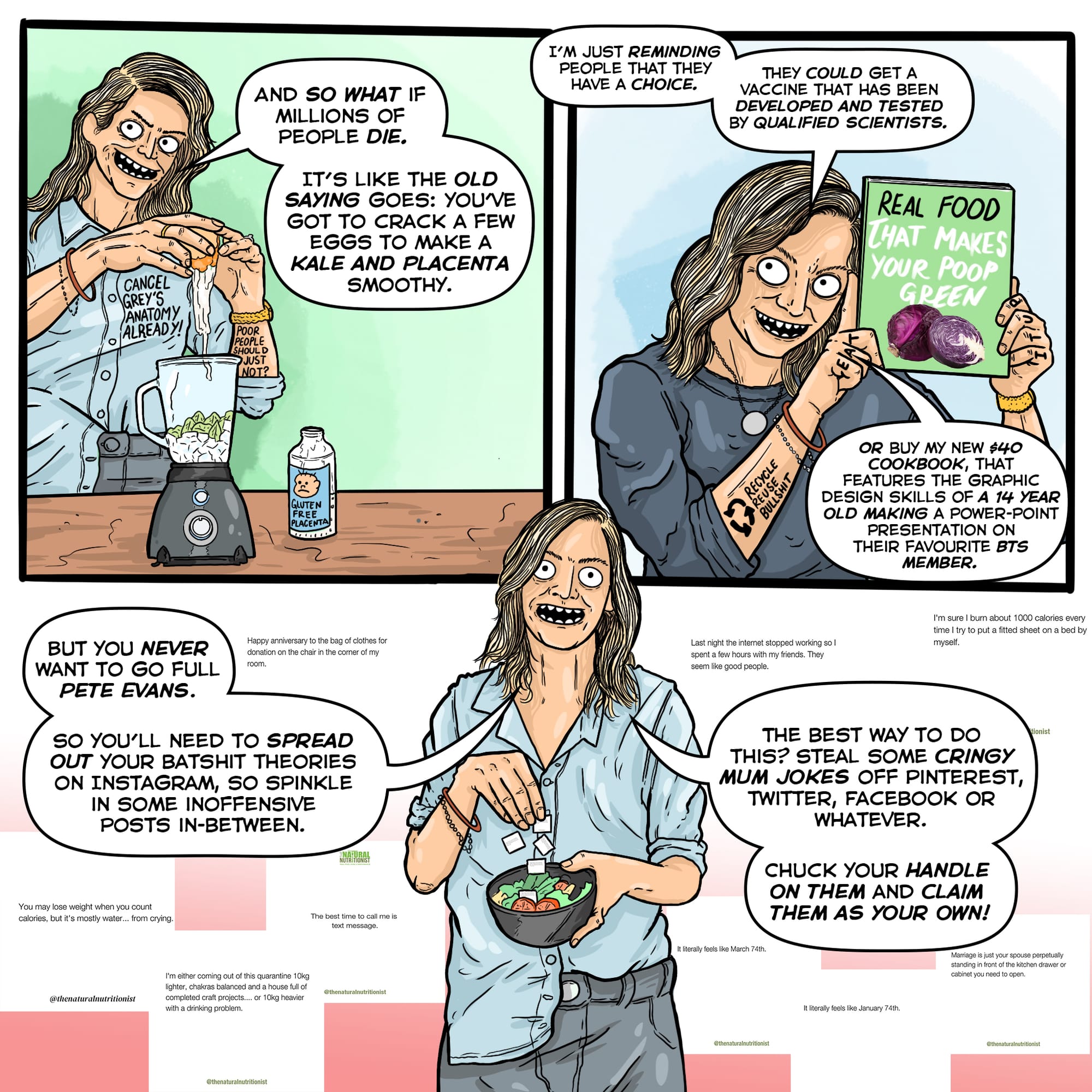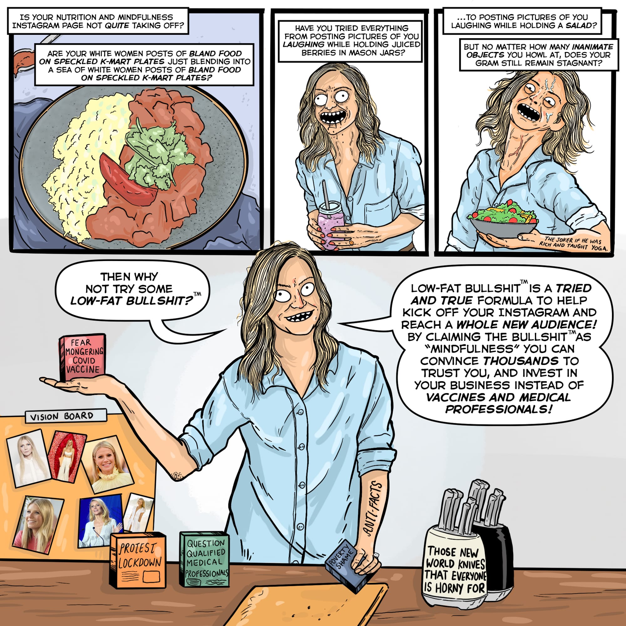 Last year, I got my friend Dan Vernon to do a comic commemorating Pete’s foray into conspiracy theories. I find reading Dan’s comics is a bit like getting an exorcism from the bullshit. They are cutting and funny and smart. And so I thought I’d get Dan’s take on these wellness influencers, too. Because we’re going to be hearing a lot from them.