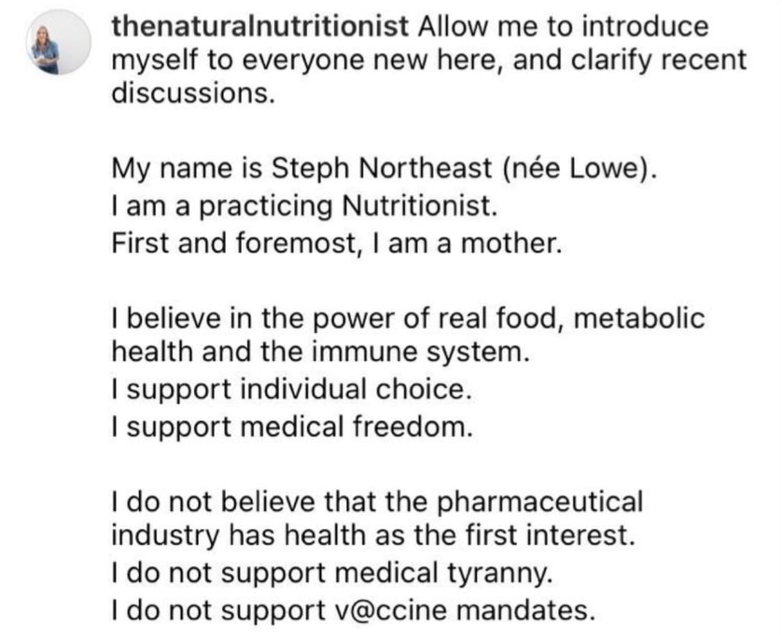 But Steph’s posts (vehement anti-vaxxer rhetoric hidden amongst recipes) are very much a sign of things to come over the next year, as the Pfizer/BioNTech and other vaccines are rolled out. We are gonna hear from a lot of wellness types telling us they’re dangerous, and to “just ask questions.” They are cookie cutters of Pete Evans, the celebrity chef I’ve written about in the past.