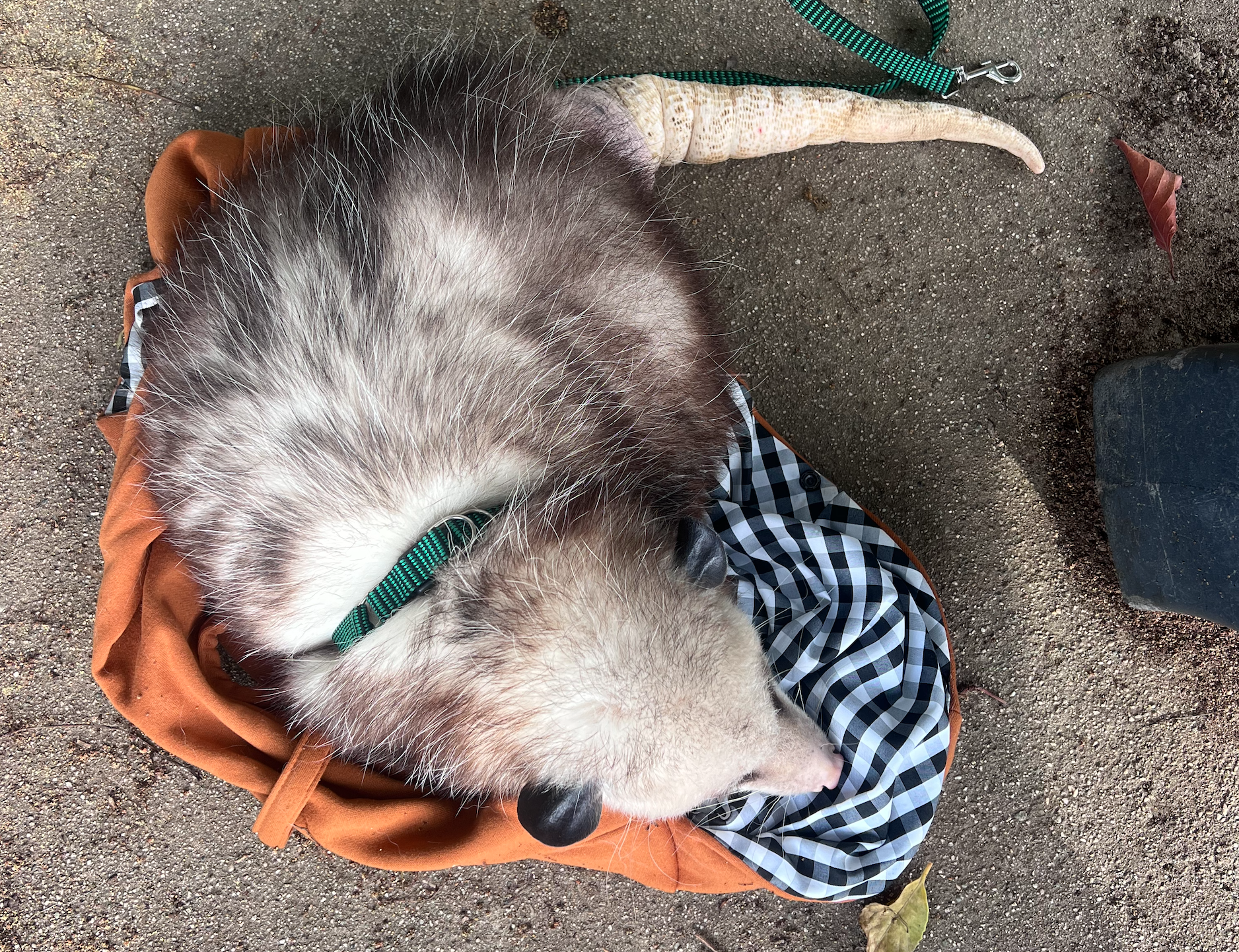 She is that person. She’s been that person since she was 17, off to college and stumbling on a possum that needed rescuing. Decades later, she’s just gotten deeper. Her life is possums — and right now one of her rehabs, Horace, is tonguing my big toe.