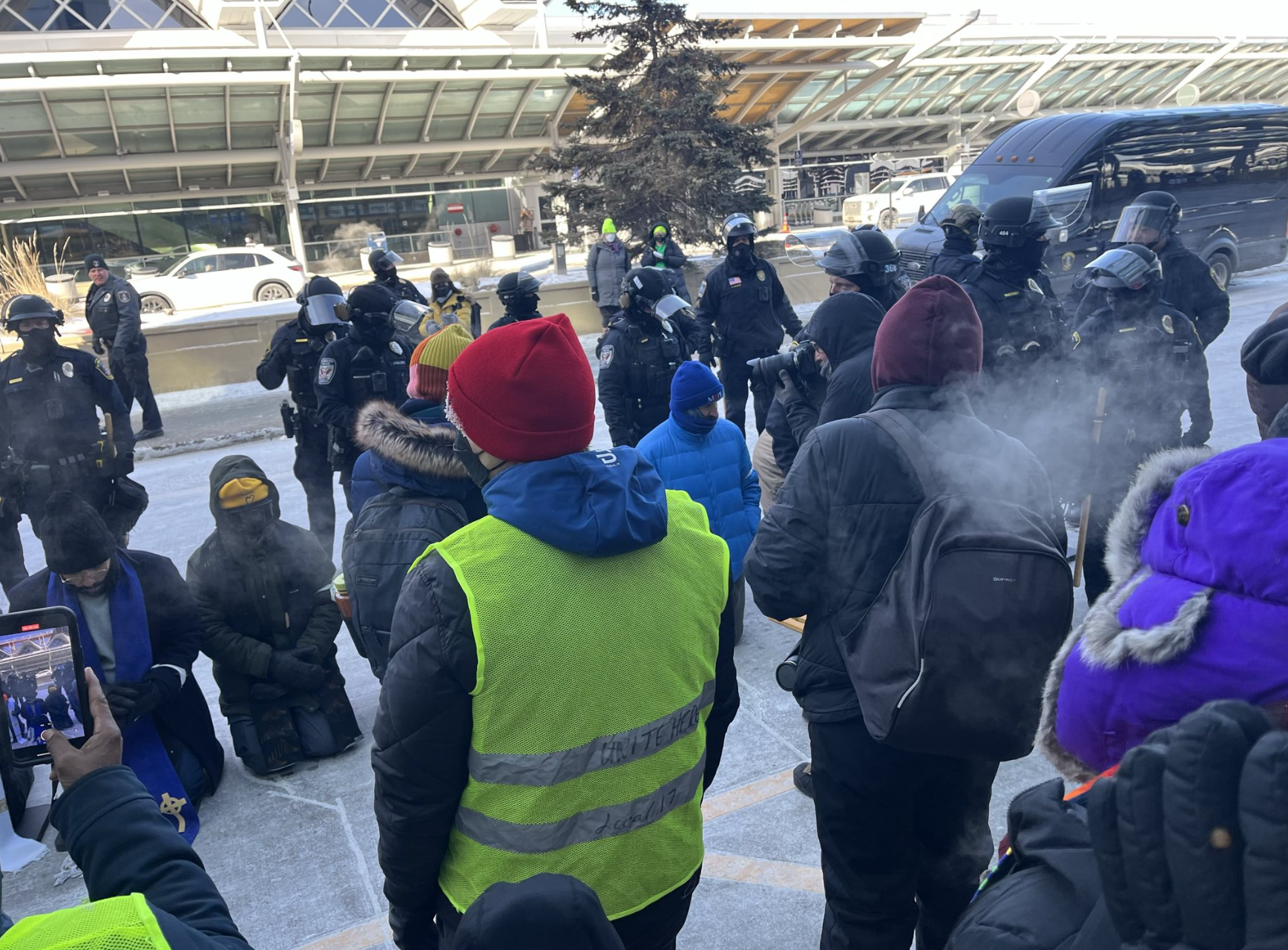 There's a small fire burning so people can warm their hands (it's -22°F), fueled by logs thrown on by a big guy in a fluro vest. He tells me he lives in the neighboring building, and sees it as his duty to act as a kind of security. He tells me ICE keeps doing laps every day, just to make their presence known.