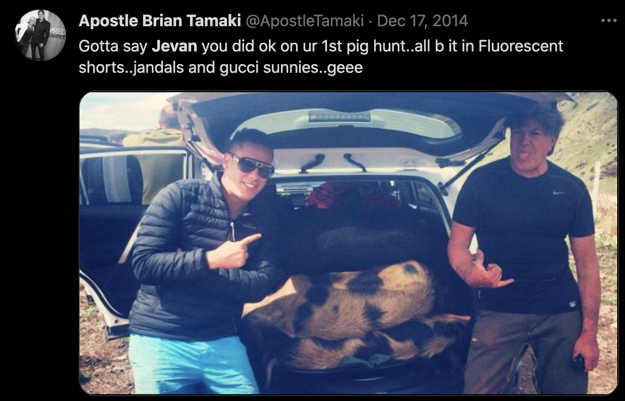 Who stepped to the Tamakis PR defence? Jevan Goulter — a gay man who was there to say “The Tamaki’s Are Okay With Me, a Gay Man!” Brian Tamaki would go pig hunting with Jevan. Buddies, bros, Christians.