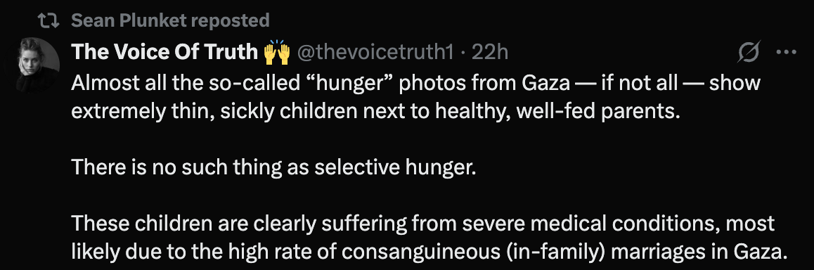 Plunket is an elderly troll both in body and mind, and perhaps this is his idea of a “funny joke”. But I also wonder if it’s — somehow — something even worse: That he is denying that starvation is taking place. His latest retweet (and this is rough, I feel horrific for even sharing it — but context is important) floats a theory that incest is causing the “sickly children.”